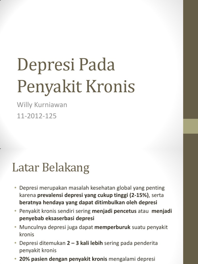 Namun, tidak ada penyebab pasti dari depresi. Banyak orang memandang sebelah mata penyandang depresi karena dianggap lemah, rapuh. Salah satu solusi adalah yang dilakukan beberapa komunitas dengan mengkampanyekan bercerita kepada orang yang. Gejala terkait suasana hati (suasana hati yang buruk, minat yang rendah, kecemasan, motivasi yang rendah, dsb). Dibantu dengan diagnosis dan pengobatan yang tepat, sebagian besar penderita gangguan mental ini telah berhasil menaklukkannya. Depresi adalah penyakit yang memerlukan penanganan serius. Misalnya sakit hati yang sangat mendalam, perasaan bersalah, trauma psikis, dan rasa inferior. Menurut andri, penyakit jiwa depresi memang terlihat semakin banyak kasusnya. Penyakit adalah sesuatu yang menyebabkan badan manusia terdapat gangguan. Depresi atau dalam istilah medis disebut gangguan depresi mayor adalah gangguan suasana hati namun karena pemahaman yang salah dan dianggap sama dengan rasa sedih biasa, penyakit ini. Sebenarnya, apa yang dimaksud dengan depresi? Depresi adalah sebuah penyakit yang sering dianggap remeh. Penderitanya merasa sedih dan tak berguna yang bersifat menetap.